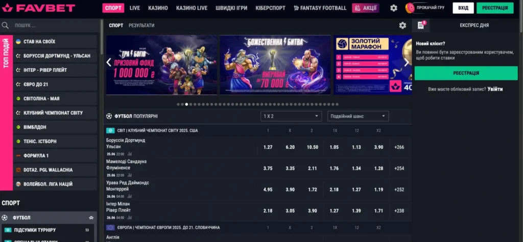 У верхній частині сайту БК Фавбет представлені головні розділи – live, кіберспорт, спортивна лінія, віртуальні змагання та казино. Там є кнопки для реєстрації та авторизації.